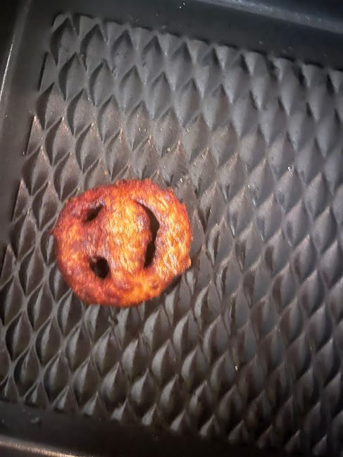 It turns out you can use mash and an airfryer to make your own potato smileys - just use cornflour and flour and a straw for shaping. They tasted much better than this picture indicates, but it was too funny not to include.