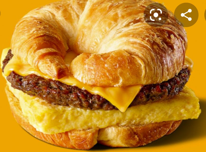 As mentioned in the previous newsletter, this was a passion project based on recreating a veggie version of the Burger King breakfast sandwich. Traditionally it consists of a sausage patty, bacon or ham, a cuboid of egg(??) and cheese in a croissant sliced like a bun.
